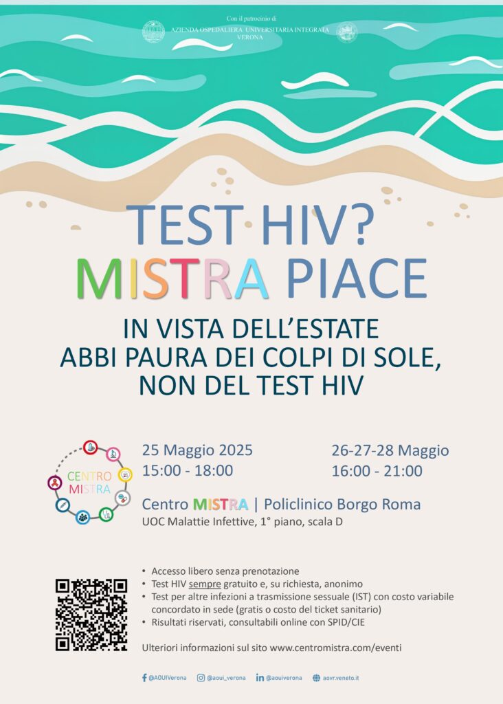 Presso gli ambulatori delle Malattie Infettive del policlinico di Borgo Roma (scala D, 1° piano) verranno offerti test per HIV e altre infezioni a trasmissione sessuale domenica 25 maggio dalle 15.00 alle 18.00 e da lunedì 26 a mercoledì 28 maggio dalle 16.00 alle 21.00. L’accesso è libero, senza appuntamento.
